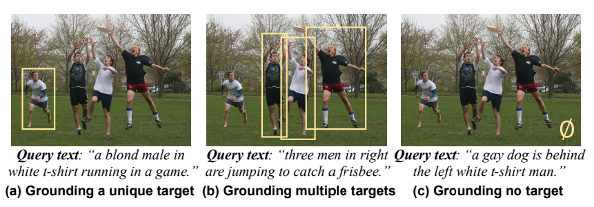 GREC / GVG | Generalized REC / Generalized Visual Grounding | 放宽“唯一目标”假设,允许指称 0 个、1 个或多个对象。 | ⟨图像, 句子⟩ → 0/1/多个 bbox | REC 的广义扩展,需新评估指标(如 Precision@(F1=1)、N-acc)。 |