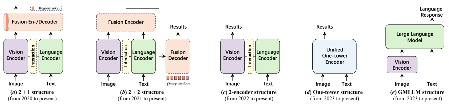 Visual Grounding 的模型架构经历了从 CNN-based 两阶段方法 → Transformer-based 端到端检测 → 多模态大语言模型(GMLLM) 的演进。根据视觉-语言交互方式与计算流程,可将其归纳为以下五类典型框架:
