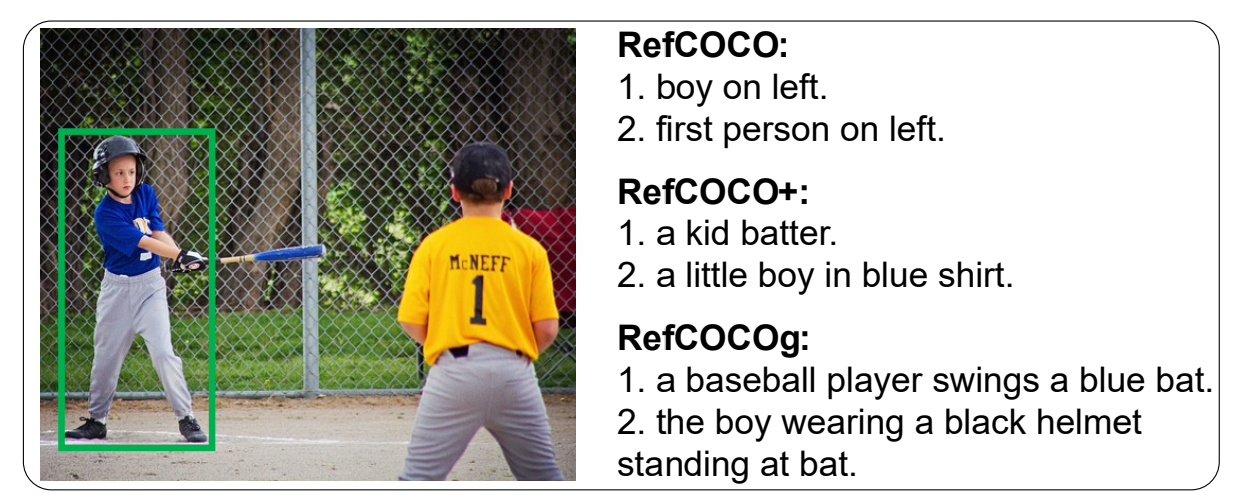 - 典型数据集: RefCOCO / RefCOCO+ / RefCOCOg/ReferItGame、Flickr30k Entities