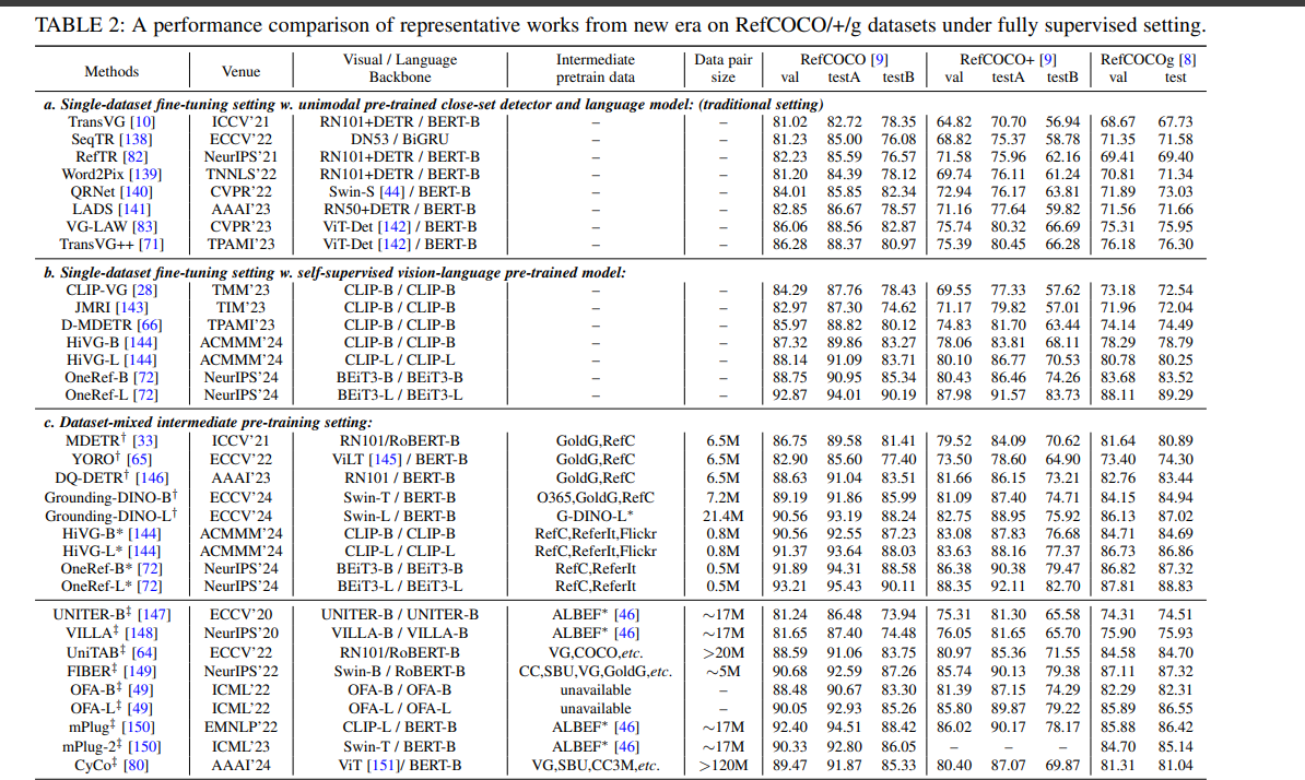 2+1(双编码器 + 融合模块) | 区域提议 + 跨模态匹配 | TransVG, ReSC, CLIP-VG | 传统 REC(单目标、闭集) |