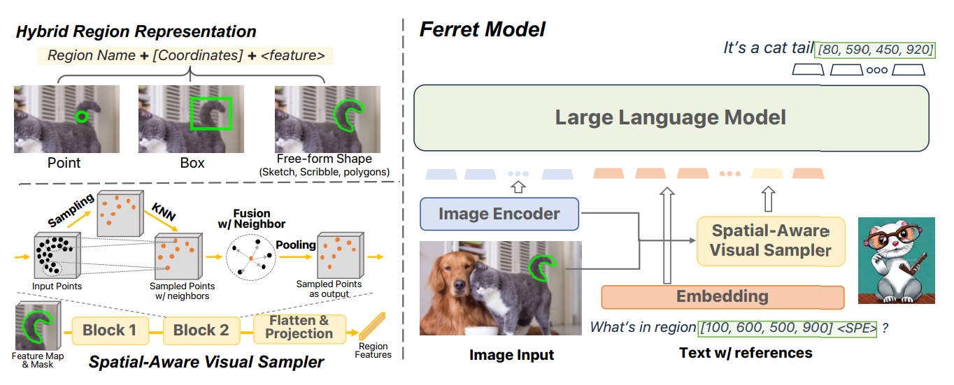 Ferret 模型中,关键组件之一是 Spatial-Aware Visual Sampler(空间感知视觉采样器),它的作用是提取图像中任意形状区域的连续视觉特征,以支持对点、框、自由形状(如涂鸦、多边形等)的精细理解。