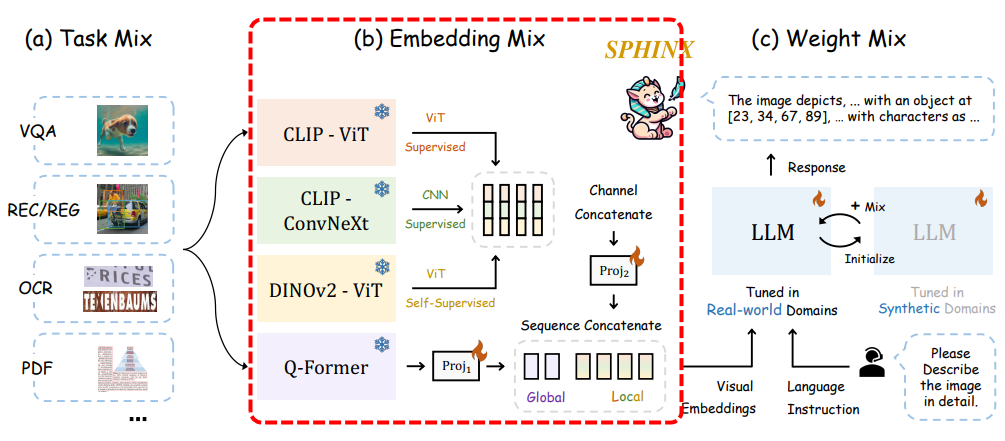 实际上,在这篇工作之前就有项工作SPHINX(2023)13在多视觉编码器信息融合上做得更为彻底(如下图),其也考虑token量过大的问题,采用一个proj层来压缩token数。
