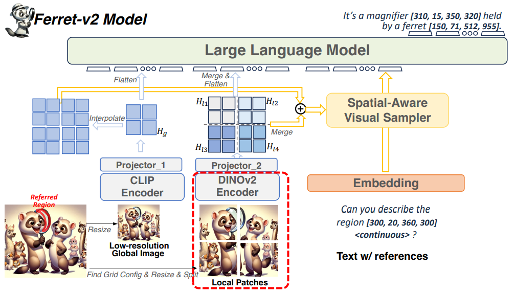 在Ferret-v212中引入 DiNOv2 的主要动机是为了解决高分辨率图像处理中“全局语义”与“局部细节”之间存在粒度差异的问题,从而增强模型对细粒度视觉信息的理解和感知能力。