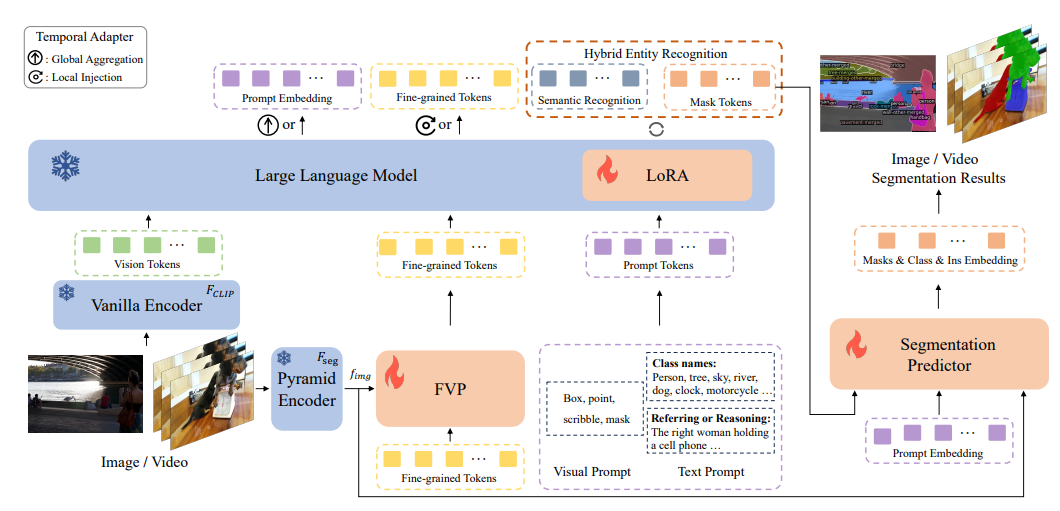 类比于LLaVA-Grounding的工作,GLaMM和HyperSeg15采用额外的分割模型(SAM、Mask2former)来处理分割任务,在推理时,LLM 只负责语义,视觉细节和交给外挂的分割模型。